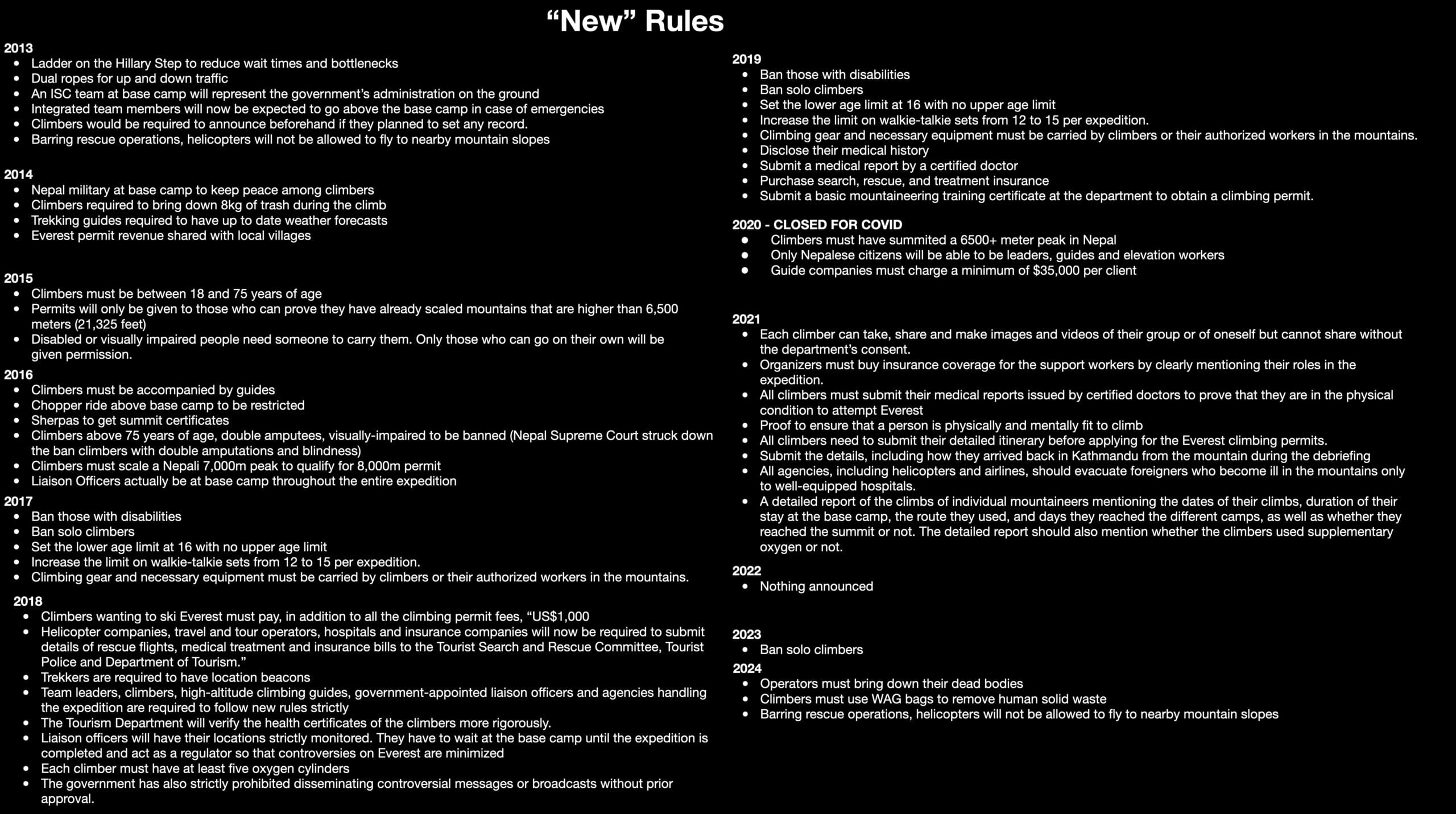 Bu arada yetkililer devamlı olarak Şerpaların çalışma koşullarını iyileştirmek ve tırmanışları belli kurallara bağlamak için ellerinden geleni yapma sözü veriyor. Bu yıl ilk kez olmak üzere dağcılar bir dışkı torbası taşımak zorunda kalacaklar. Bu, diğer zirveler için zaten mevcut olan ve zorunlu hale gelen bir yükümlülüktür.