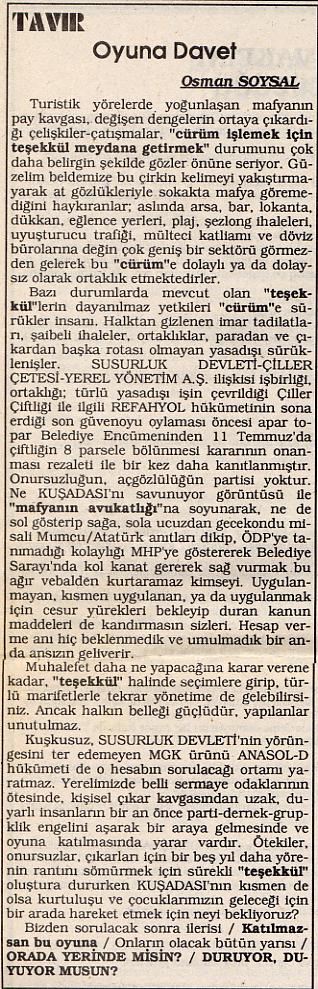 Oyuna davet - 10 Ağustos 1997 Super User tarafından 30 Mart 2009 tarihinde yazıldı. Kategori: Kusadası Gözlem. Önceki Sonraki