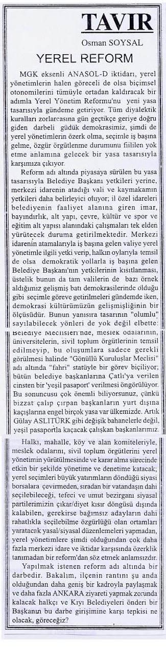 Yerel reform - 10 Ekim 1998 Super User tarafından 30 Mart 2009 tarihinde yazıldı. Kategori: Kusadası Gözlem. Önceki Sonraki