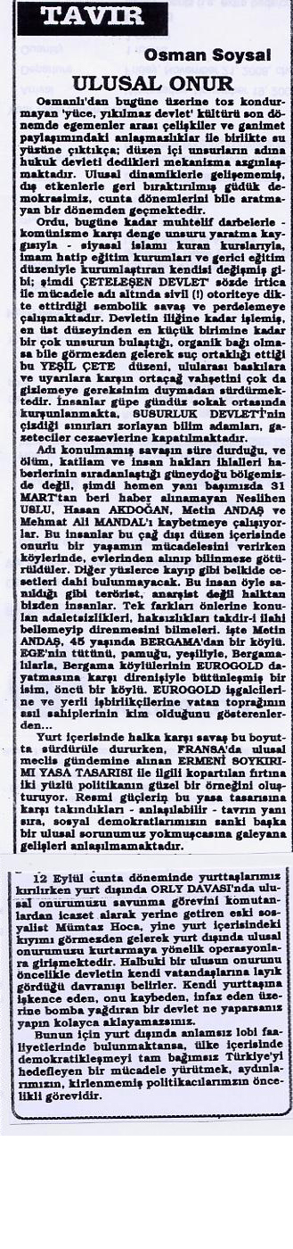 Ulusal Onur - 30 Haziran 1998 Super User tarafından 30 Mart 2009 tarihinde yazıldı. Kategori: Kusadası Gözlem. Önceki Sonraki