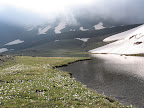 Sabah erkenden, çabucak dost olduğumuz kangal köpekleri eşliğinde köyün hemen güneyinde yer alan vadiden yürüyerek çanağa yöneliyorum. Haziran’ın ikinci haftası; hava soğuk ve yükseklerde kar/buz yığınları var. Bölgenin bu kesiminde ağaç yok ancak her yer yemyeşil; rengarenk çiçeklerin arasında bölgenin endemik bitkisi ters lale ve her derde deva yabani sarmısak dikkatimi çekiyor. Dağdaki buzullardan akan derenin oluşturduğu vadinin başlangıçlarında eski taş yapı kalıntıları bulunuyor. Burayı aştıktan sonra yorulan köpekler geri dönüyor.